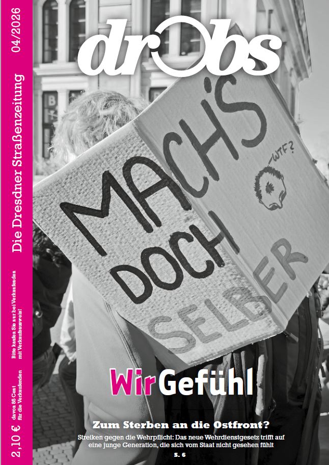 Wir präsentieren: Unsere druckfrische April-Ausgabe unter dem Titelthema „WirGefühl“, die ihr seit Monatsbeginn auf Dresdens Straßen erwerben könnt!80 Prozent der Deutschen sehen den gesellschaftlichen Zusammenhalt in Gefahr. Besonders oft glauben das Menschen mit niedrigem Bildungsstand und Einkommen – und damit dieselben Bevölkerungsgruppen, die überdurchschnittlich oft links- und rechtspopulistische Parteien oder aber gar nicht wählen.